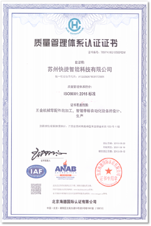 截止2025年,快捷智能已荣获国家高新技术企业、科技型中小企业、瞪羚企业、专精特新中小企业、企业技术中心等多项荣誉,通过质量管理体系认证等多项企业和产品认证。